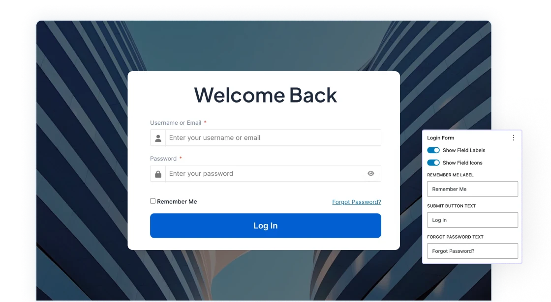 Spectra includes a simple drag and drop form builder feature that lets you build beautiful, easy-to-use login forms.