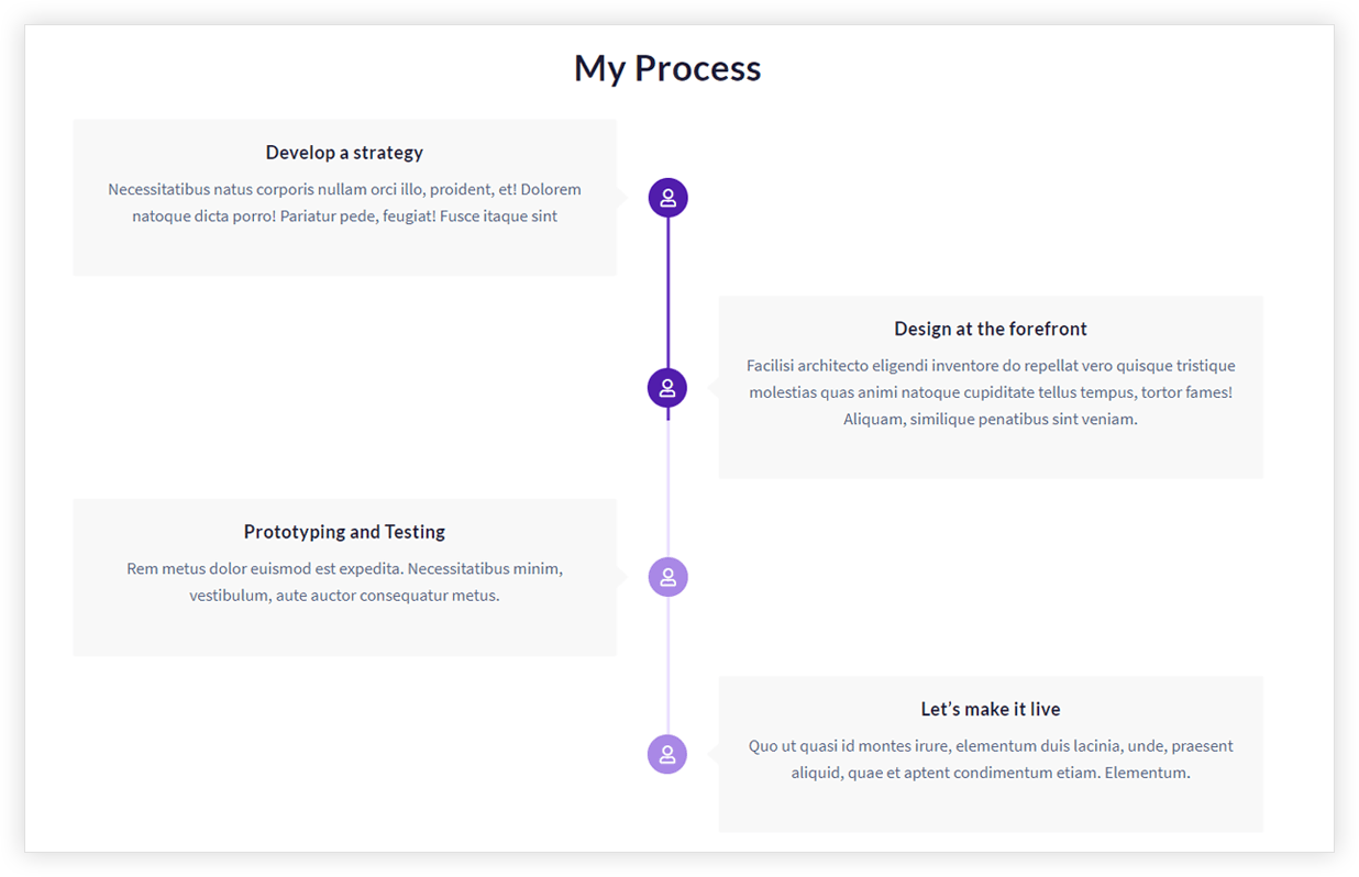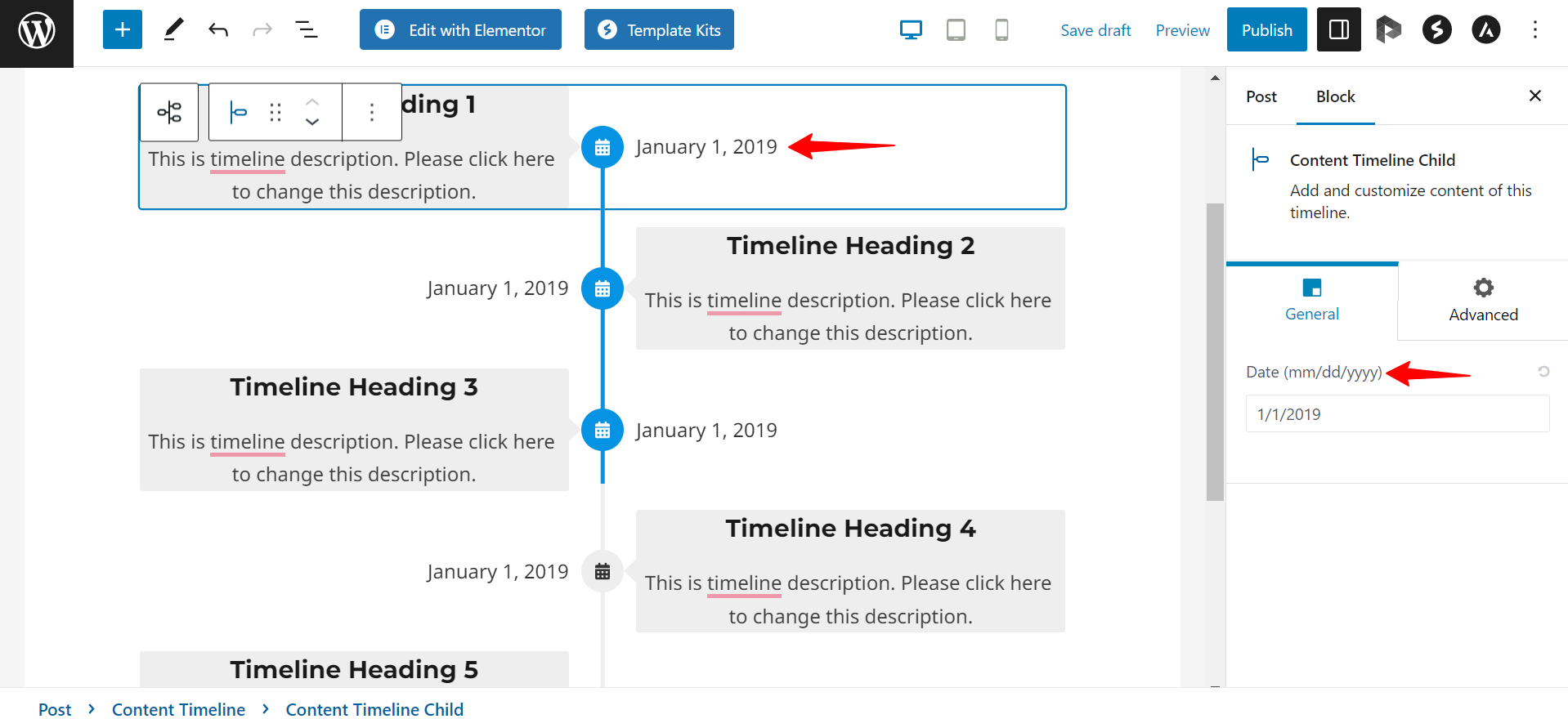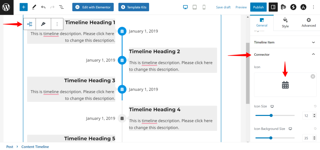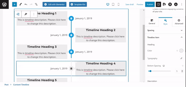 Content Timeline is a flexible block that allows displaying historical events with vertical timeline items. The block contains various customization options to make your timeline attractive. You can add a title, description, icon, date to the timeline items. Color and typography options allow designing the timeline to suit your website theme.