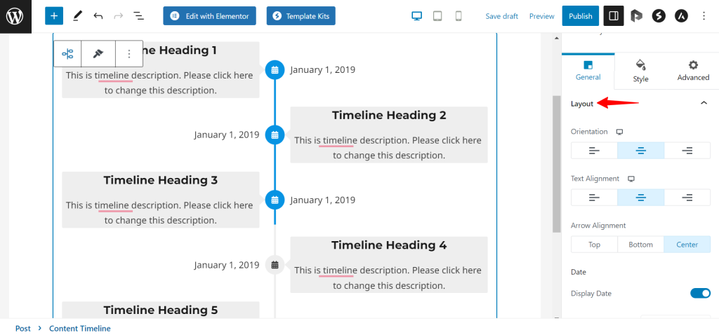Layout for the icon and a timeline card can be set to Center, Left, Right from Layout > Orientation. Arrow Alignment can be set vertically top, bottom or center with respect to timeline card.