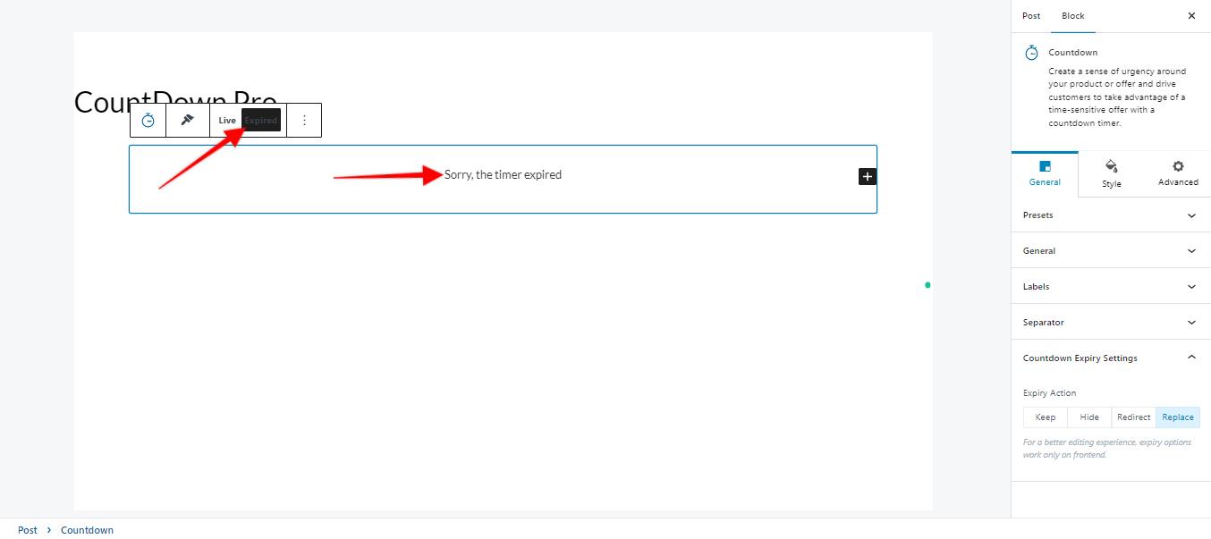 Replace: This option will let you choose a custom block to replace the timer once it is expired. Once you click on this option, you will see the available option on the block. Select the expired option and choose a block that you would like to replace the timer with.