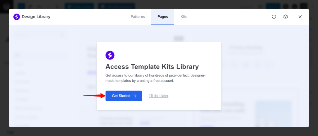 Spectra plugin integrates the “Design Library” button directly into the block editor. This button provides a one-click access point to the Template Kit library.
