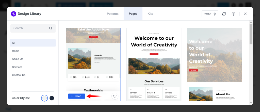 Now, head back to the “Pages” section and select the specific page template you want to use. Click on the “Insert” button again. Your chosen page will be instantly created and ready for customization within seconds.