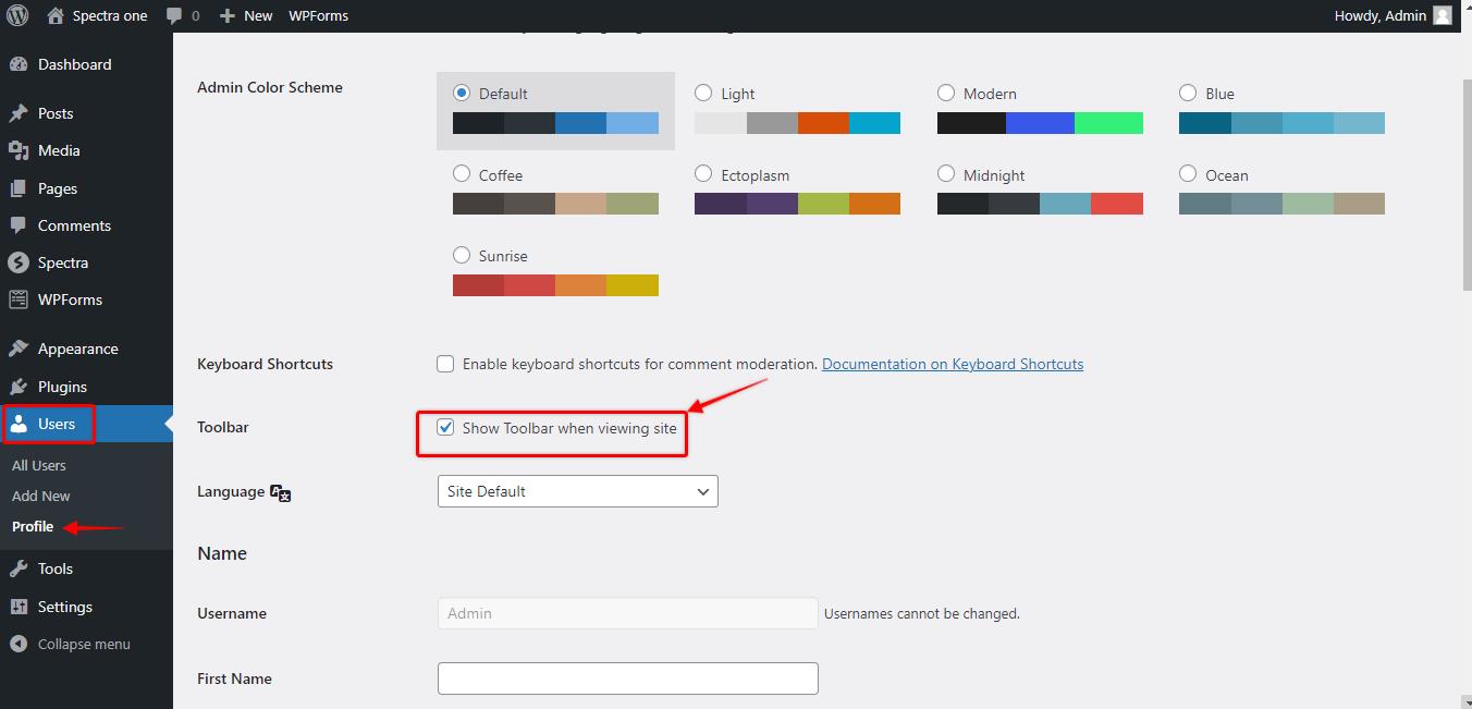 Ensure that the admin bar is enabled on your WordPress website. You can check this in the “Users” section of your WordPress dashboard, under “Your Profile.” Make sure the “Show Toolbar when viewing the site” option is selected.
