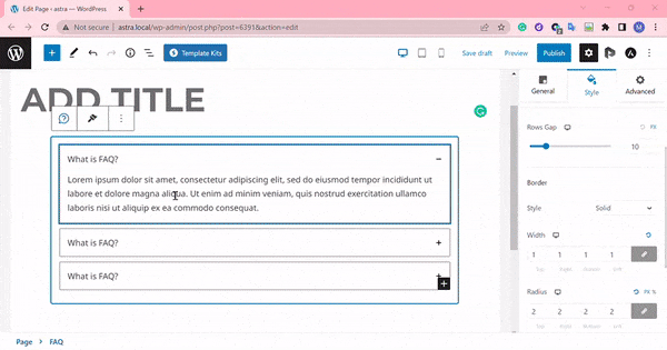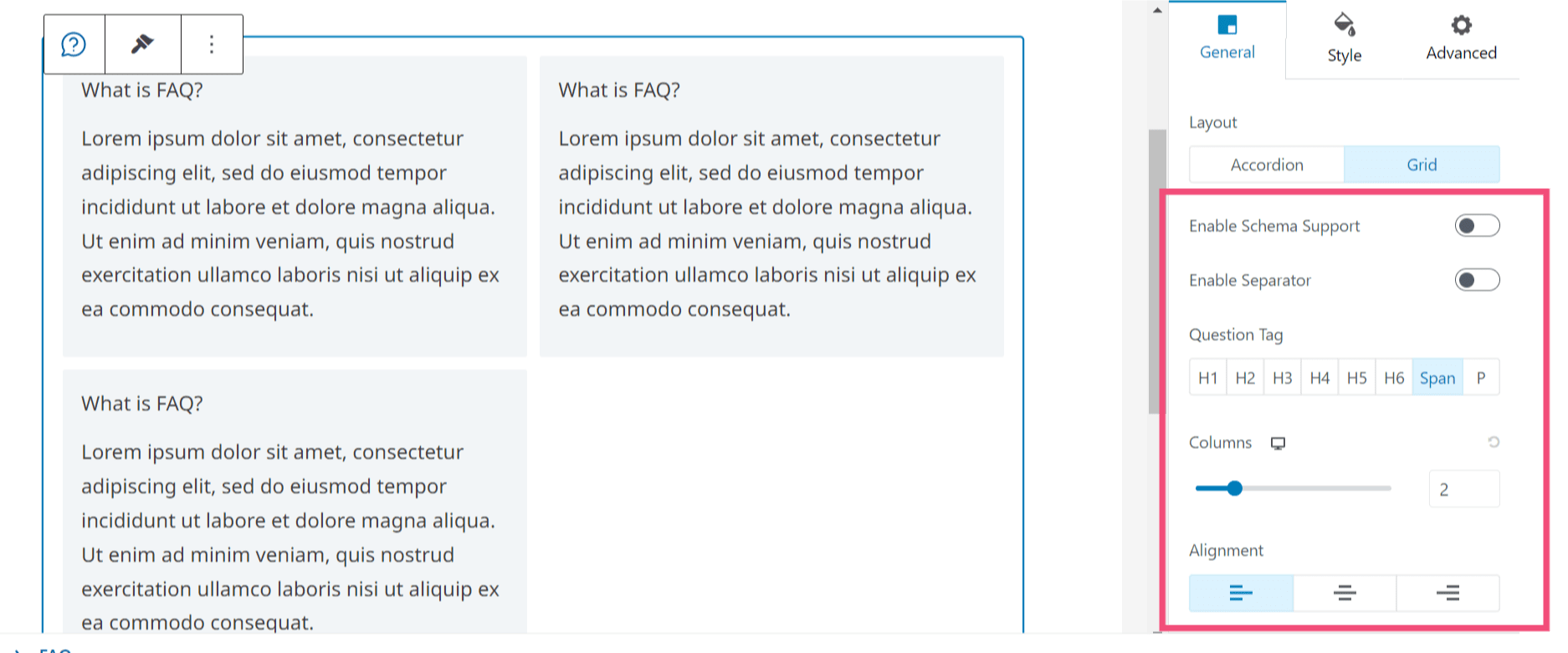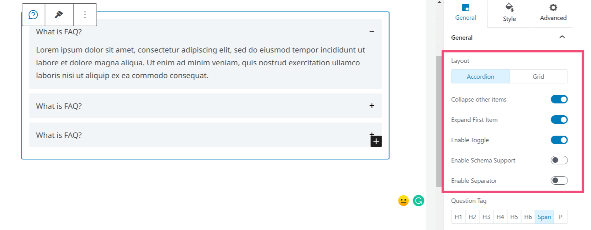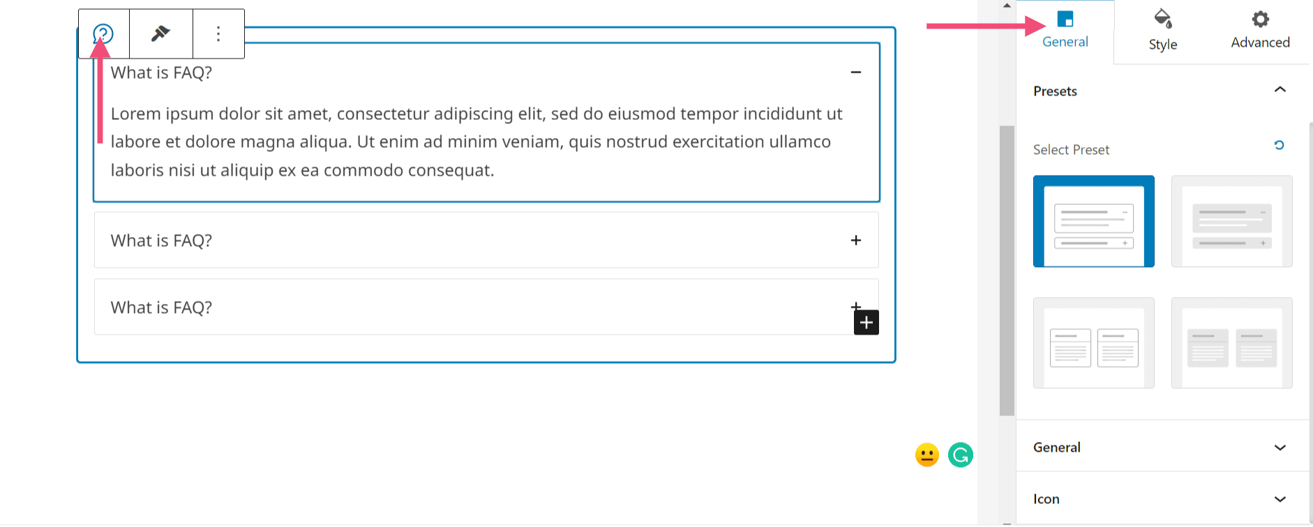 When you drag and drop the FAQ block in the block editor, you can see the block presets under the ‘General’ settings. You can select the block preset from here.