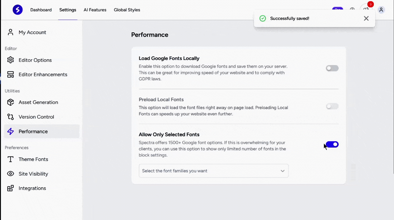 Spectra offers 1500+ Google font options. If this is overwhelming for your clients, you can use this option to show only limited number of fonts in the block settings.