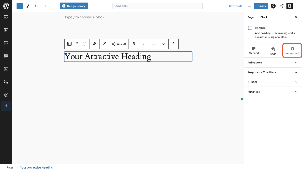 There’s also the advanced tab that’ll let you add animations, decide block display conditions, adjust the Z-index, and configure additional CSS code: