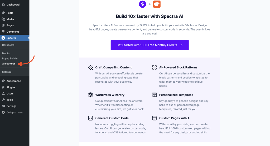 - AI Features: Make beautiful-looking website pages using our ZipWP AI. Spectra provides 1000 free monthly AI credits so that you can try it out for free.