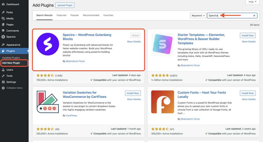 You can simply follow the below steps to install the Spectra plugin on your WordPress website: