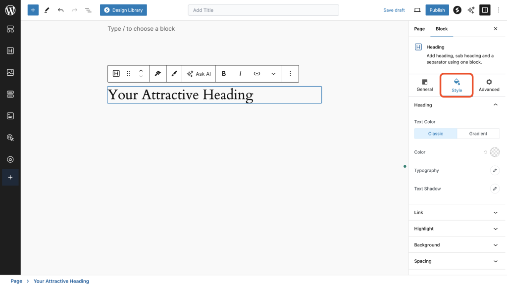 These options change according to each block. Within the “Style” tab, you’ll be able to customize the appearance of your block such as color, typography, background, and more: