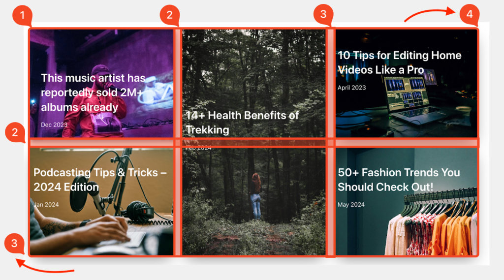 To center the top-right grid cell featuring the image “14+ Health Benefits of Trekking,” we have to move it to the second column. To do this: