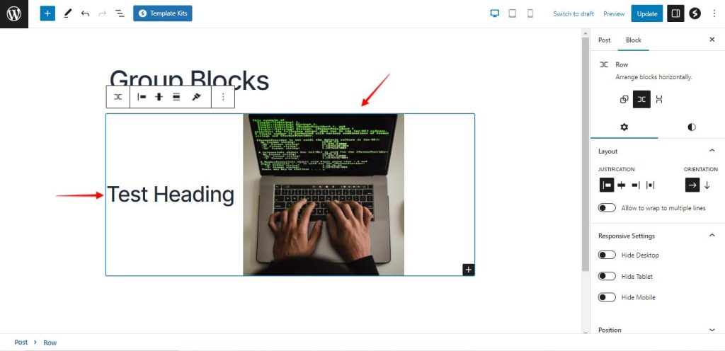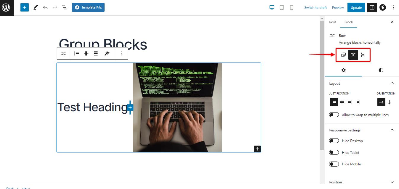 1. Justification: this option allows you to change the alignment of the blocks inside the group block. You can either position the blocks aligned to the left, right, or center or even create a space between them.