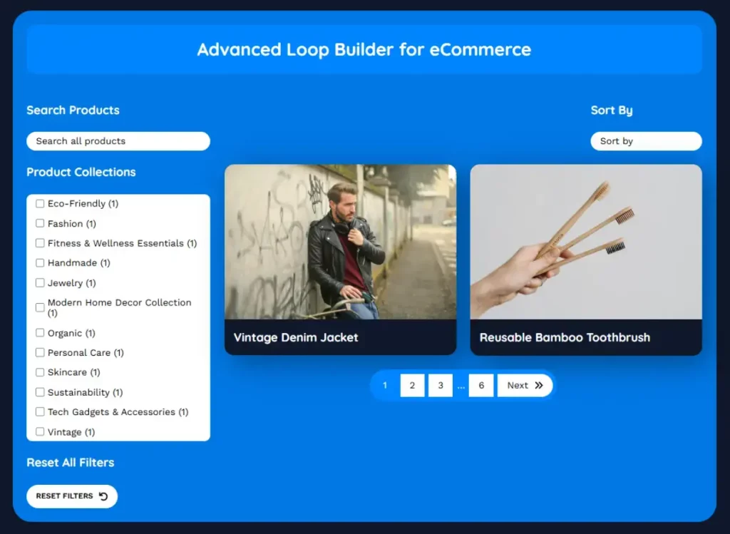 Modern product grid with advanced filtering, sorting, and shopping features.