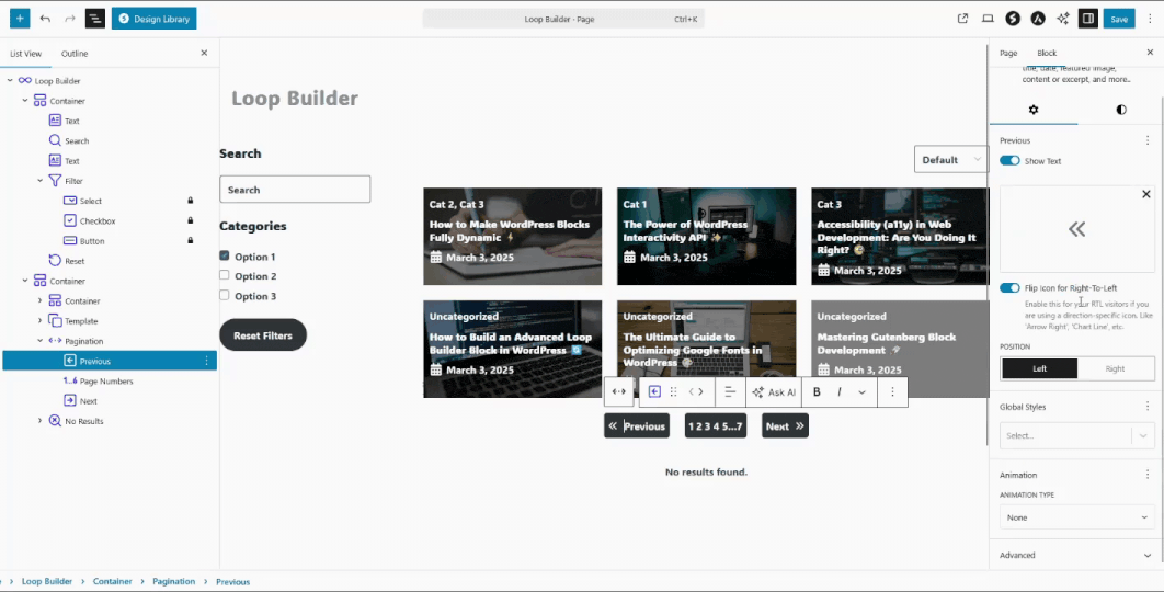 - Pagination – Previous/Next/Page Numbers