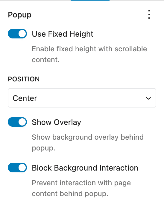 The Popup Builder Block is composed of several key components that work together: