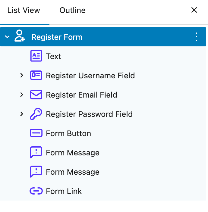 The Register Form Block uses a parent-child relationship: