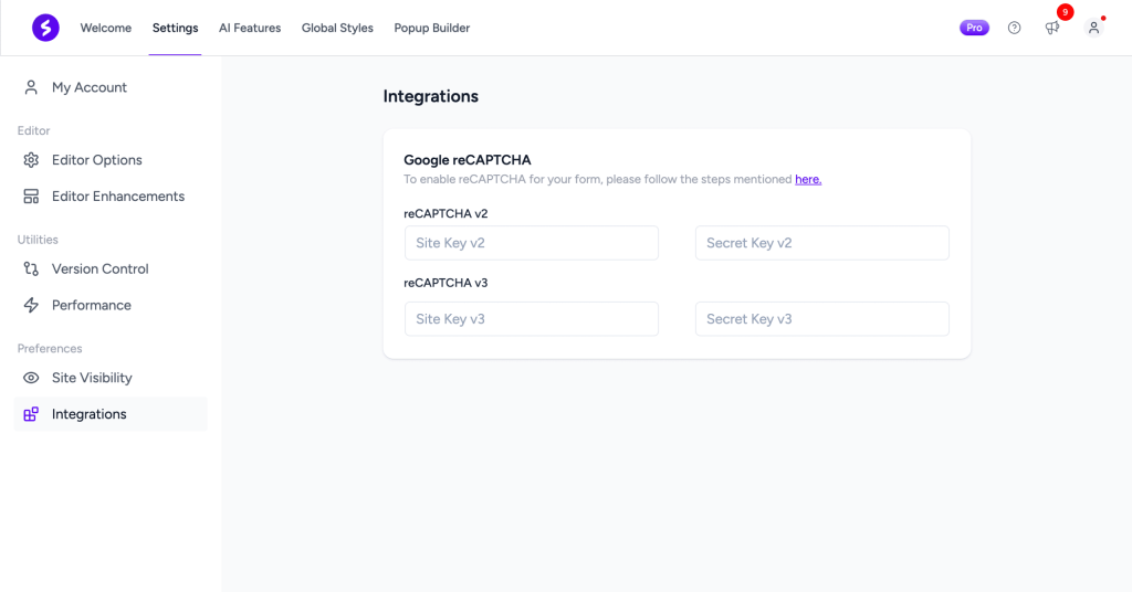 - Configure reCAPTCHA keys in Spectra Pro settings