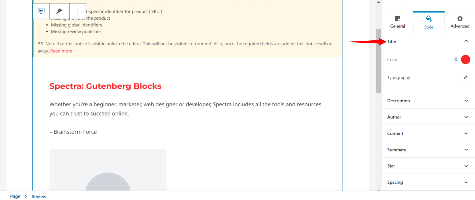 Style the Review Schema using the following styling options ranging from Typography to Color and Padding —