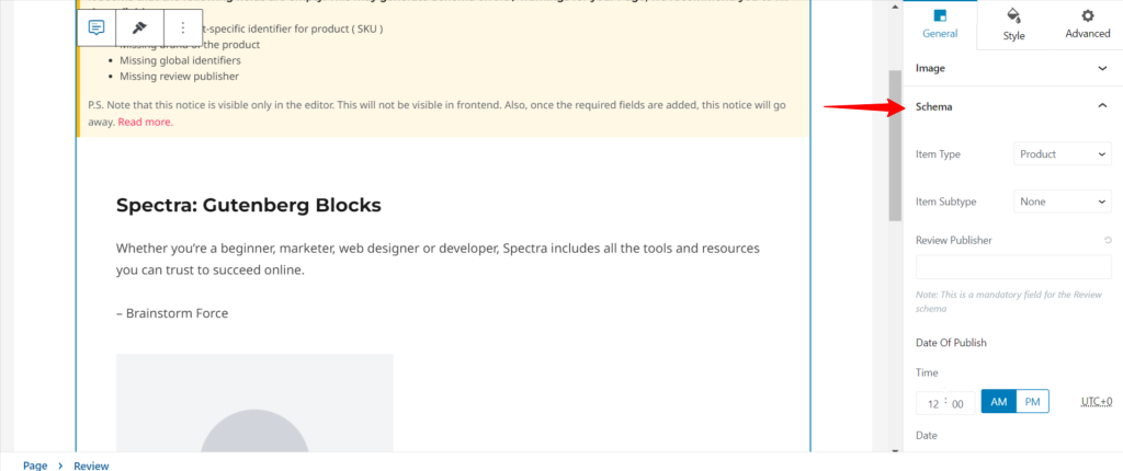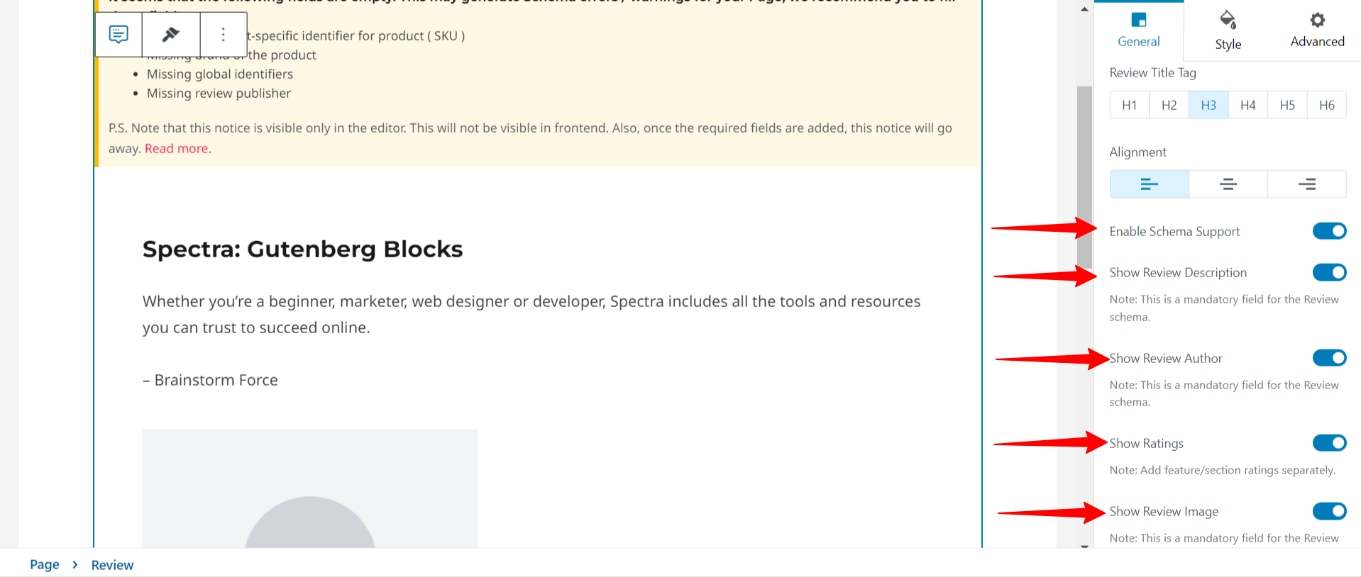 And following are the options which can be used to Show/Hide options from the Review Schema Block —