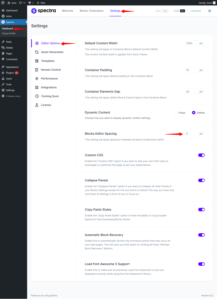 To enable the Blocks Editor Spacing option, go to Spectra > Dashboard > Settings > Editor Options > Blocks Editor Spacing. You can input the value of your choice, and the settings will be saved automatically.