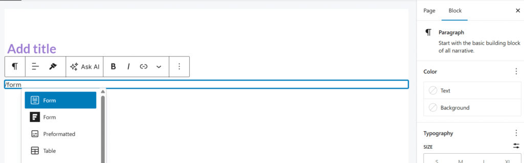 • Search for and select the Form block.