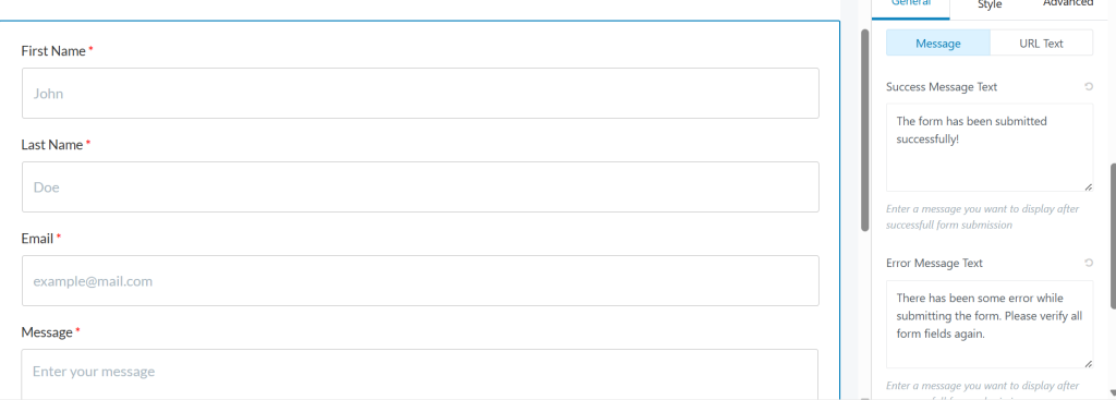 • Navigate to the General tab under General Settings to edit messages you want to display after form success or failure.