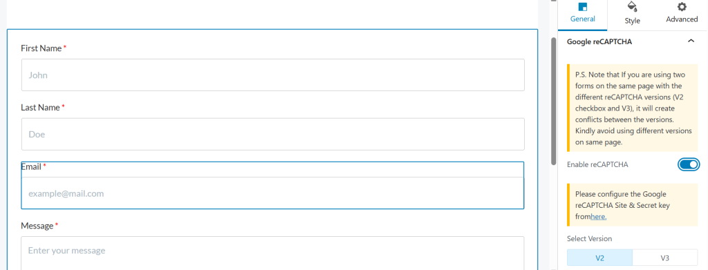 Note: Configure your preferred reCAPTCHA version and secret key at Spectra > Settings > Integrations in your WordPress admin.
