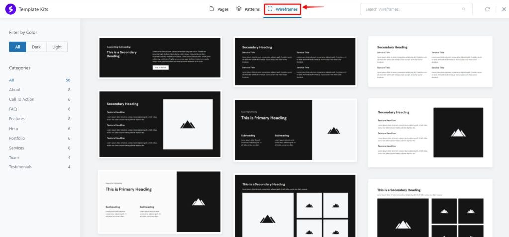 Step 2 – In the top menu of the Library, click on the “Wireframes” tab. Here you can find all wireframe blocks available;