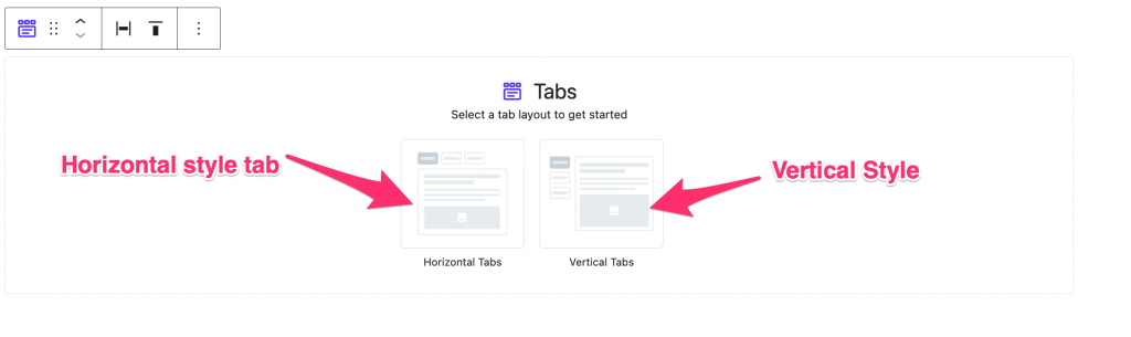 When you add the Tabs block in the block editor, you can see the block presets under the You can select the block preset from there to quickly change the design style.