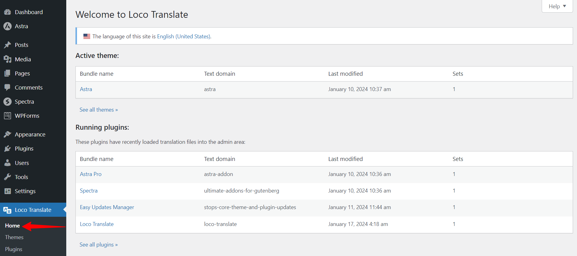 • From the WordPress dashboard, Navigate to Loco Translate > Home.