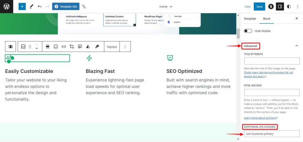 Step 3: Copy the class ID “swt-duotone-primary” and paste it under the Additional CSS Class option. You can also use the class ID “swt-duotone-secondary”. It is used to convert black svg to white when the styles are changed using style variation
