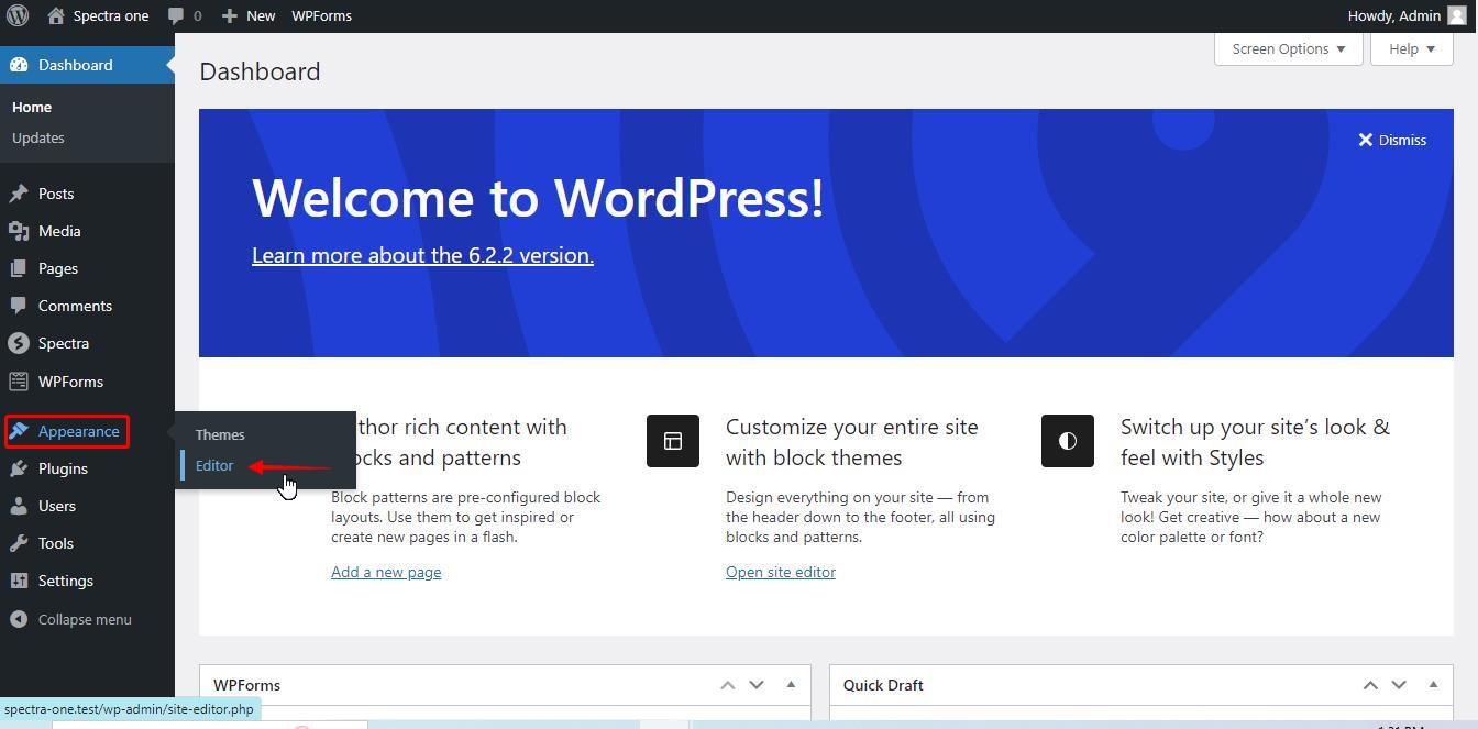 Log in to your WordPress dashboard and navigate to “Appearance” and click on “Editor”.