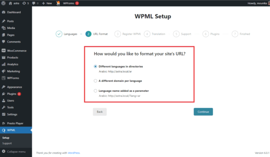 2. Configure URL Format: Set your preferred format for language URLs (e.g., subdirectories or subdomains) and click Continue.
