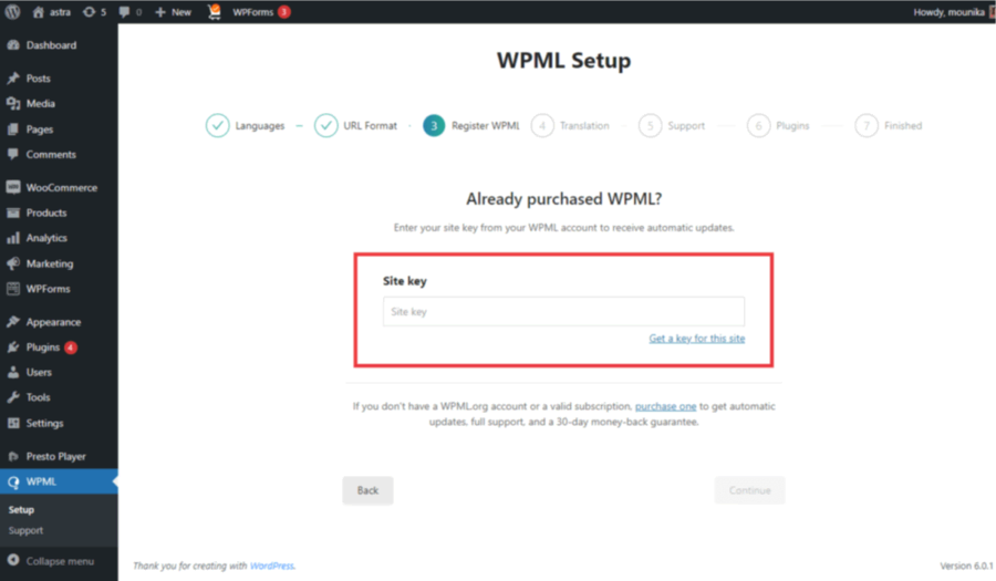3. Register WPML: Enter your site key from your WPML account to enable automatic updates. Click Continue.